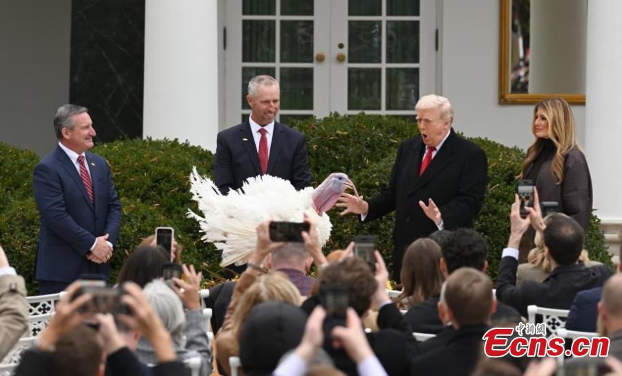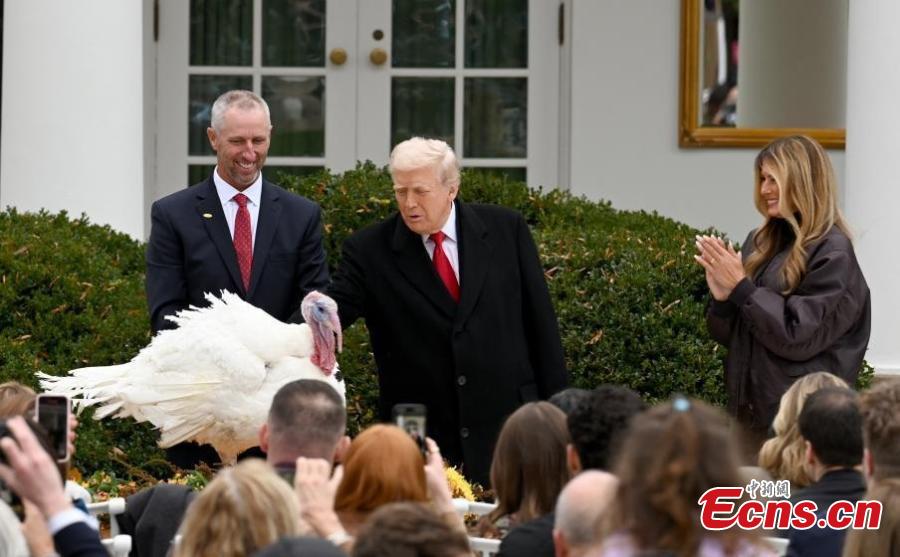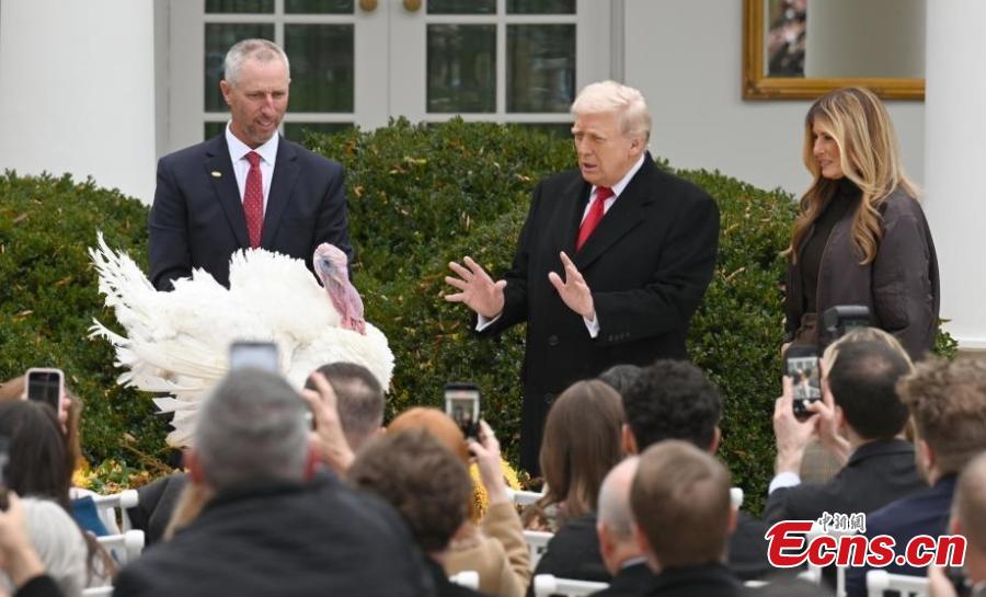 The U.S. President Donald Trump continues the tradition of ceremonially pardoning two turkeys Gobble and Waddle at the White House in Washington, D.C., U.S on Nov. 25, 2025. After an online vote, Gobble is selected to go onstage to receive the presidential pardon. (Photo: China News Service/Chen Mengtong)