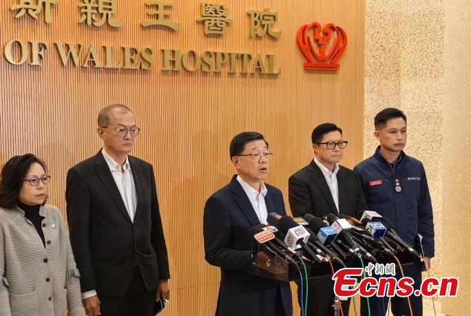 Chief Executive of the Hong Kong Special Administrative Region (HKSAR) John Lee meets the media after visiting those injured in the Tai Po fire at the hospital in the early hours of Nov. 27, 2025. (Photo provided to China News Service)
