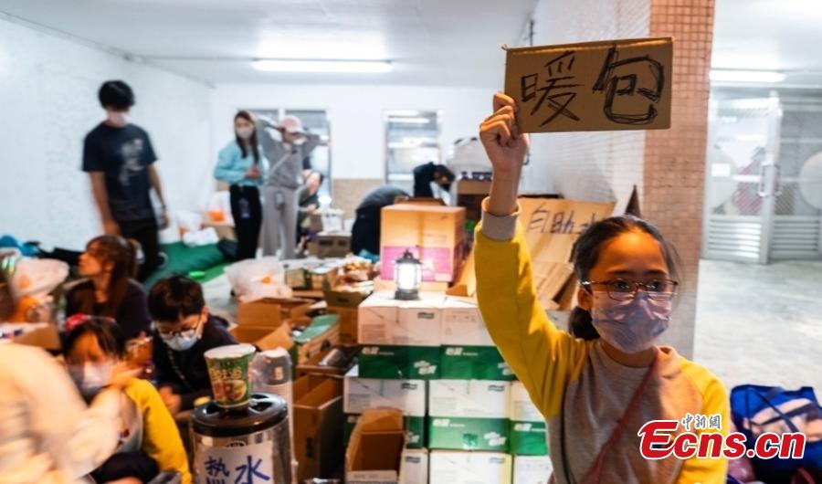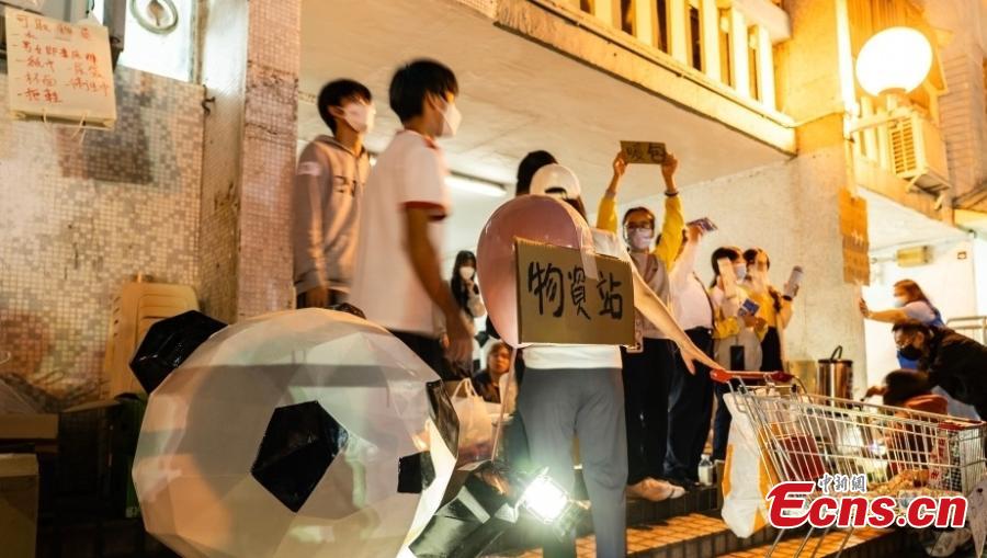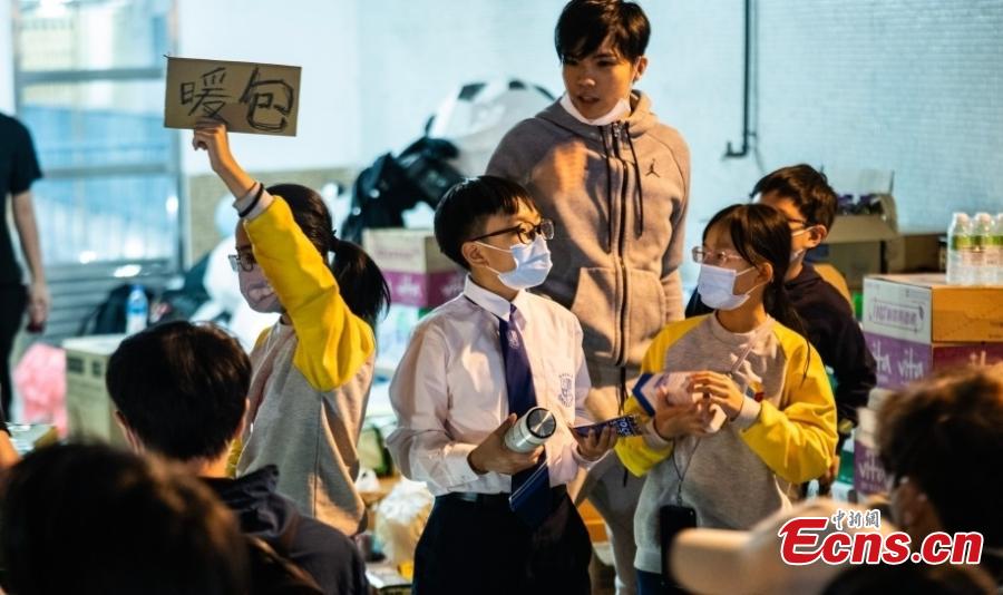 Youths provide hot water, warm packs, and other supplies for people affected by a residential area fire at Wang Fuk Court, a residential area in Tai Po of Hong Kong, on Nov. 27, 2025. (Photo: China News Service/Hou Yu)