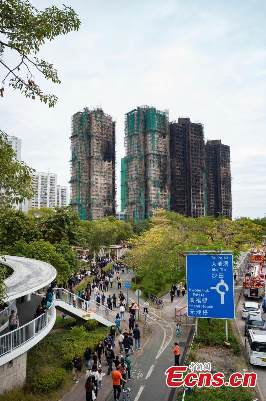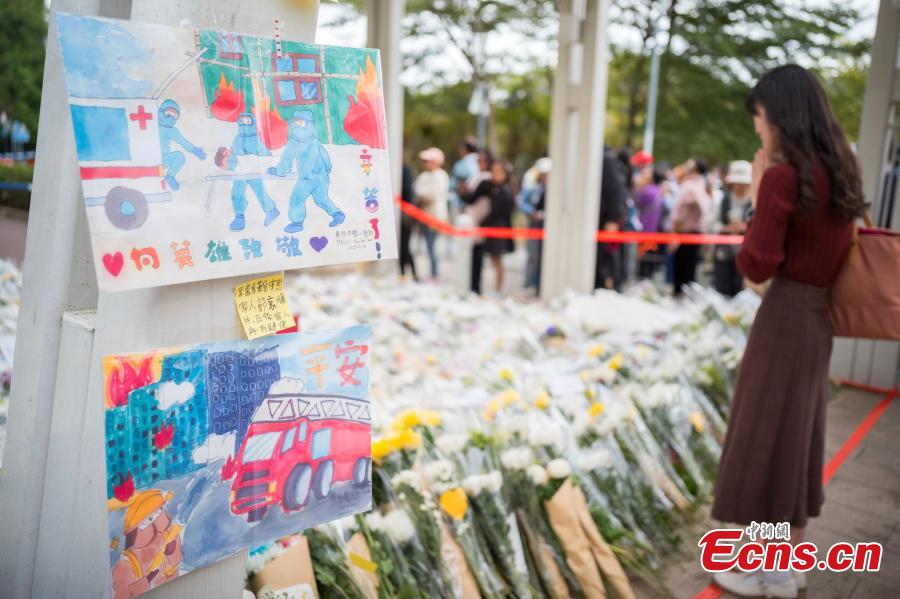 Large numbers of Hong Kong residents voluntarily line up outside the police cordon to lay flowers and mourn the fire victims at Wang Fuk Court, a residential area in Tai Po of Hong Kong, on Nov. 30, 2025. (Photo: China News Service/Hou Yu)