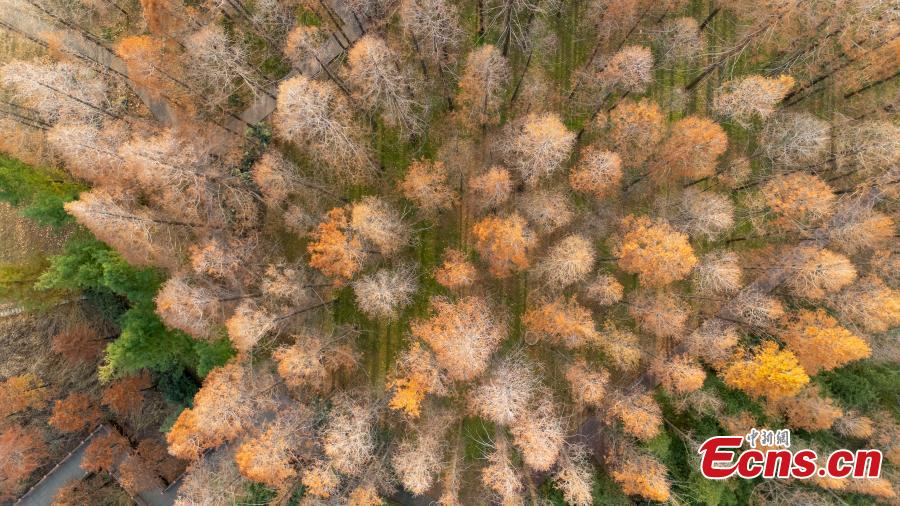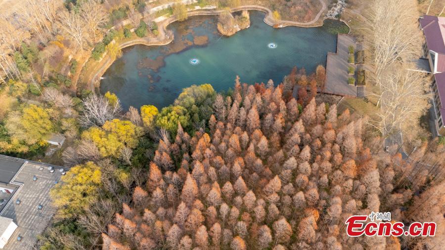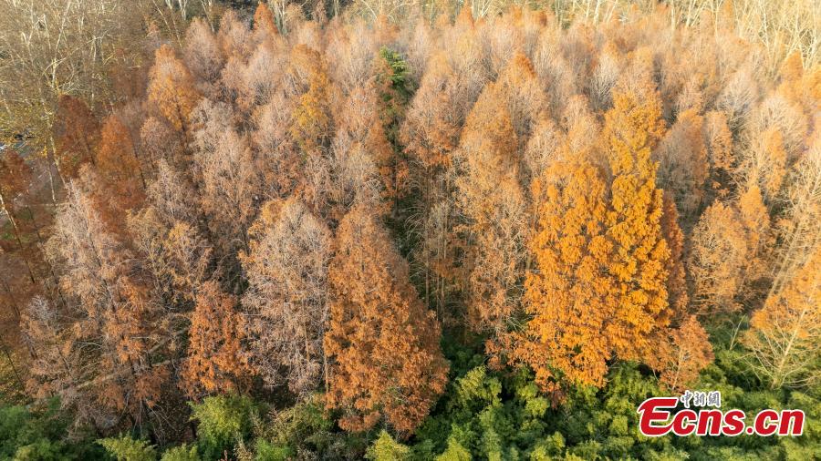 Redwood forest glows in a vivid crimson in Zhengzhou, central China's Henan Province on Dec. 2, 2025, creating a layered tapestry of color in early winter. (Photo: China News Service/Zhao Mengyang)