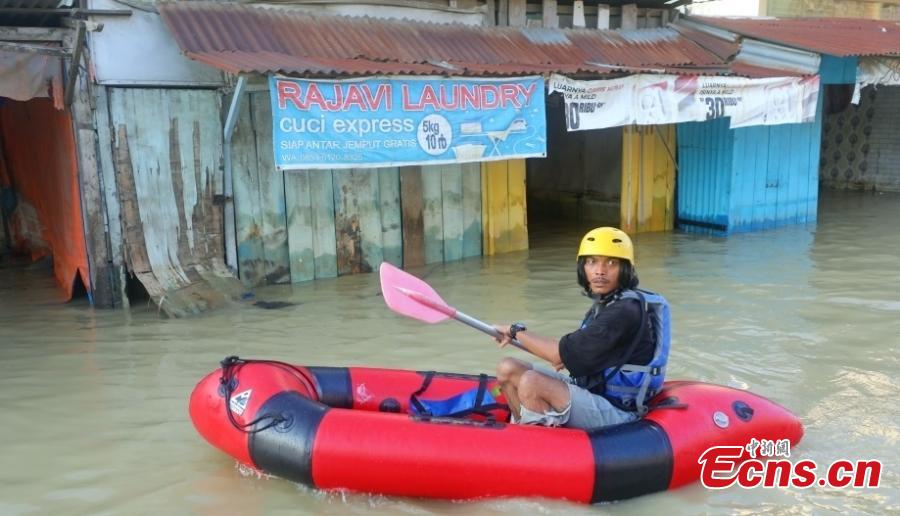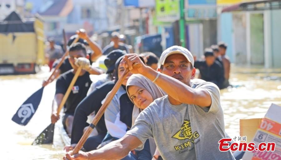 People go through flood by boat in Tanjung Pura, Langkat Regency, North Sumatra, Indonesia on Nov. 30, 2025. (Photo: China News Service/Li Zhiquan)