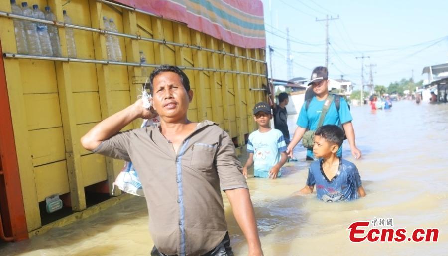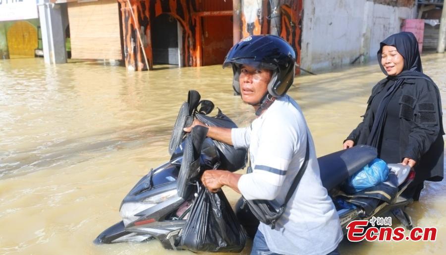 People wade through flood in Tanjung Pura, Langkat Regency, North Sumatra, Indonesia on Nov. 30, 2025. (Photo: China News Service/Li Zhiquan)
