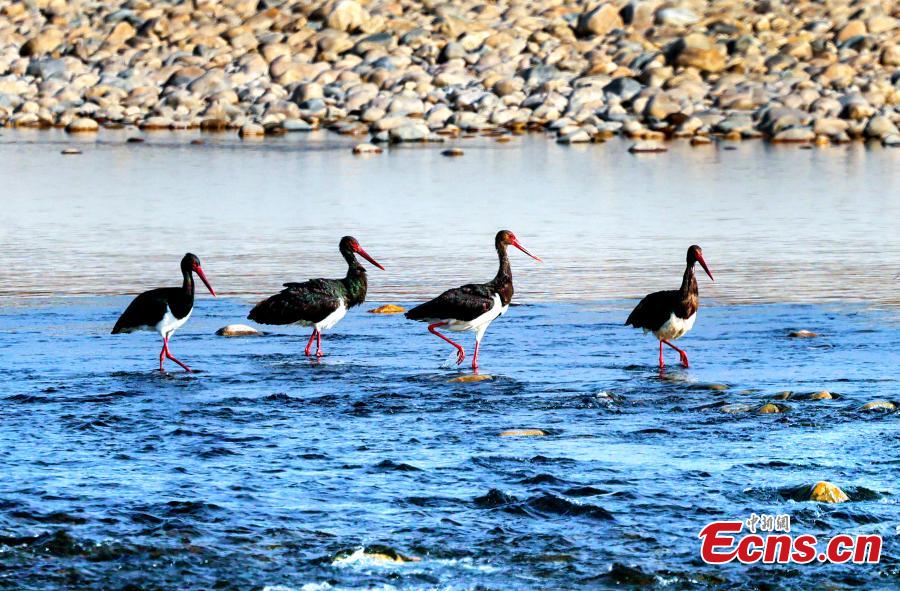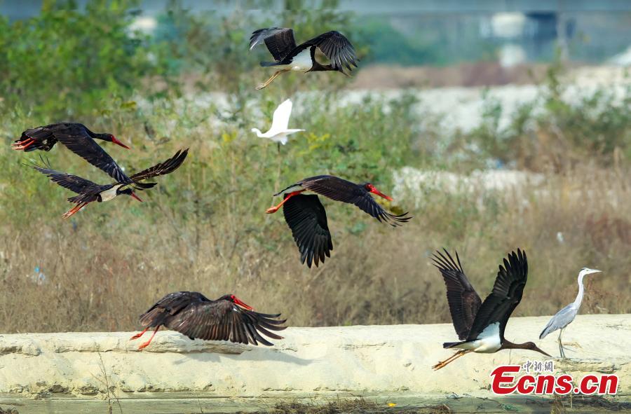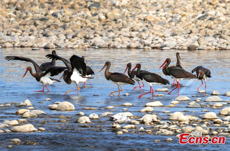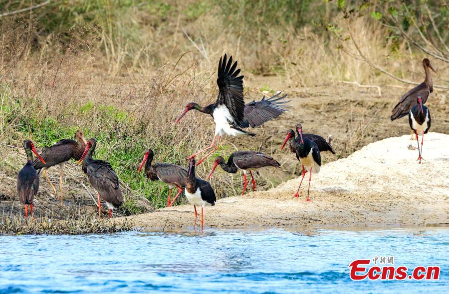 This photo released on Dec. 3, 2025 shows more than 30 black storks forage in groups along the Xushui River in Hanzhong City, northwest China's Shaanxi Province. (Photo provided to China News Service)