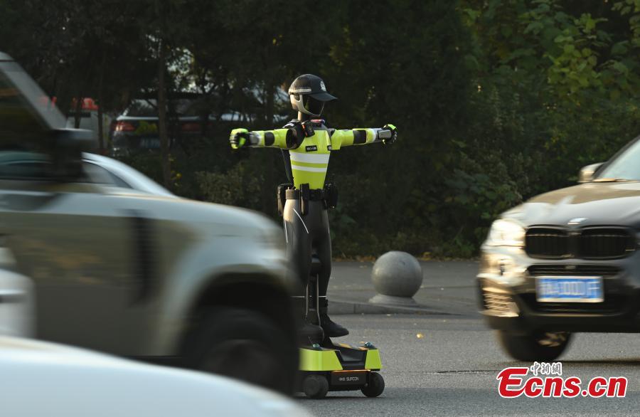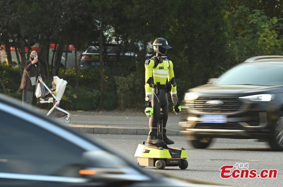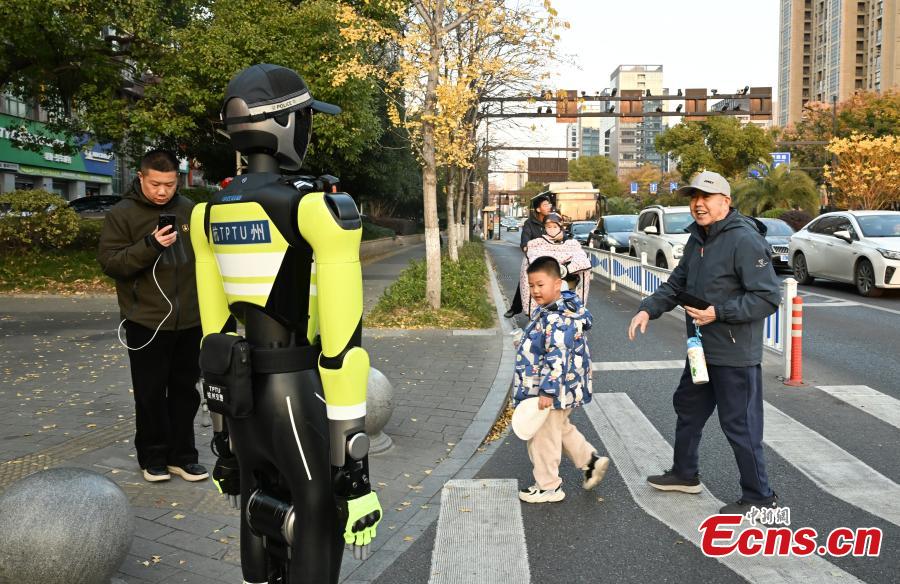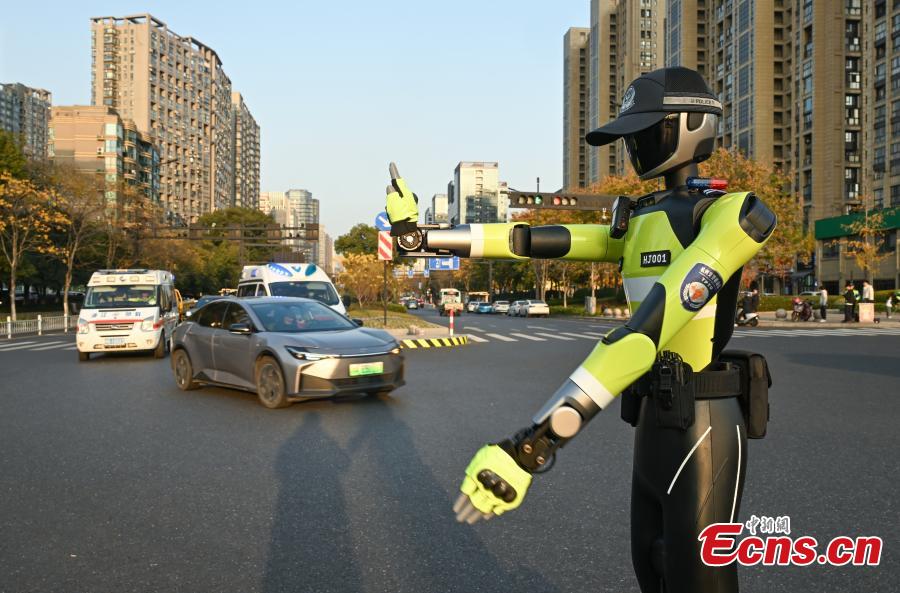 An AI traffic management robot directs traffic in Hangzhou City, east China’s Zhejiang Province, on Dec. 3, 2025. (Photo: China News Service/Wang Gang)
