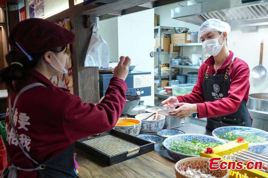 Staff members prepare food for customers at a noodle restaurant run by hearing-impaired individuals in Zhengzhou, central China’s Henan Province, Dec. 3, 2025. (Photo: China News Service/Fan Xiaoheng)