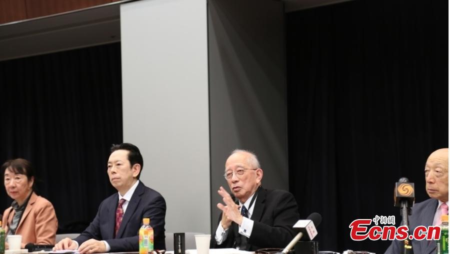 Kazuhiko Togo (second from right), an international politics scholar and former diplomat, speaks at a press conference in Tokyo on Dec. 8, 2025. (Photo: China News Service/Zhu Chenxi)