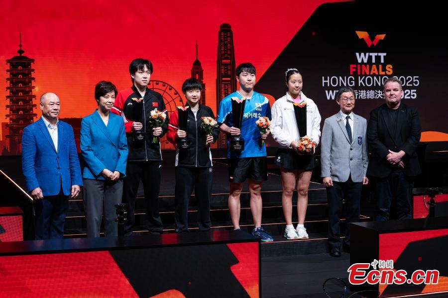 Wang Chuqin (third from left) and Sun Yingsha (fourth from left) pose at the awarding ceremony after the mixed doubles final match at the WTT Finals Hong Kong 2025 in Hong Kong, south China, Dec. 13, 2025. (Photo: China News Service/Hou Yu)