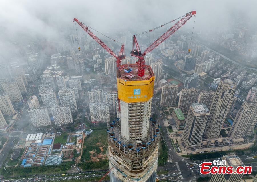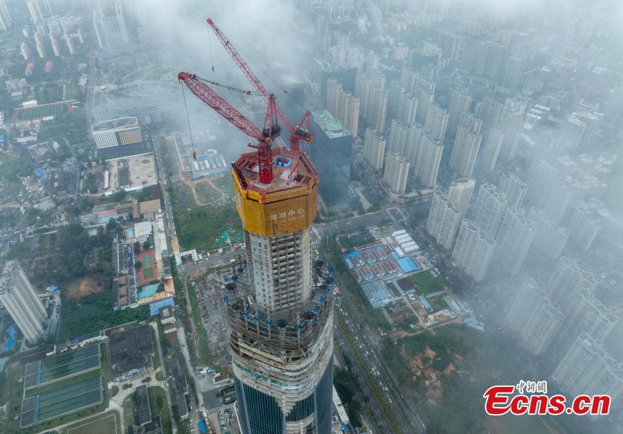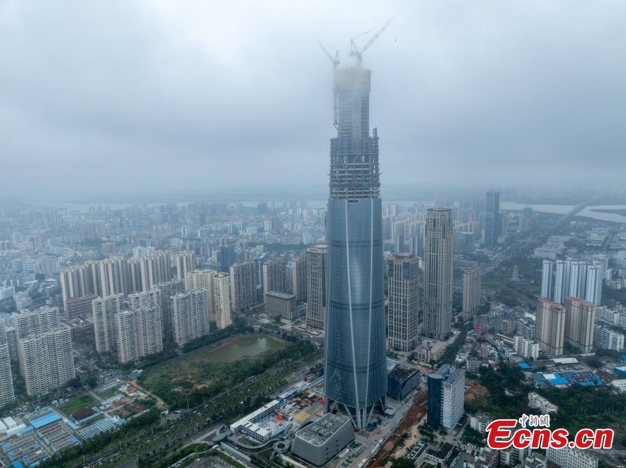 A drone photo taken on Dec. 16, 2025 shows the core tube structure of a tower at the Hainan Center project, known as the tallest building in Hainan, is topped out in Haikou City, Hainan Province. (Photo: China News Service/Luo Yunfei)