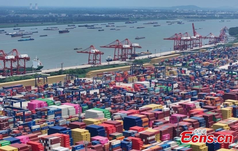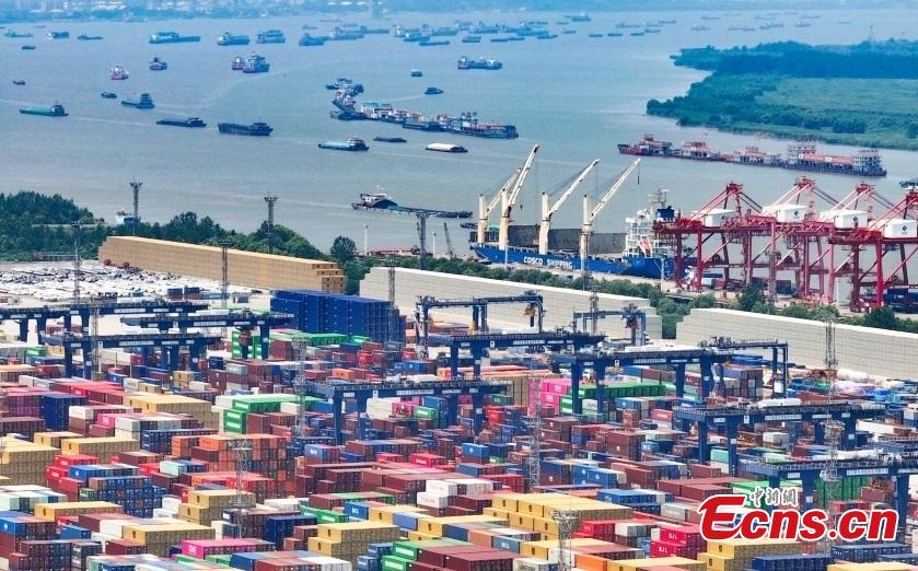 An aerial drone photo taken?on July 14, 2025 shows the import and export container terminal at Longtan Port in Nanjing City along the Yangtze River. (Photo: China News Service/Yang Bo)