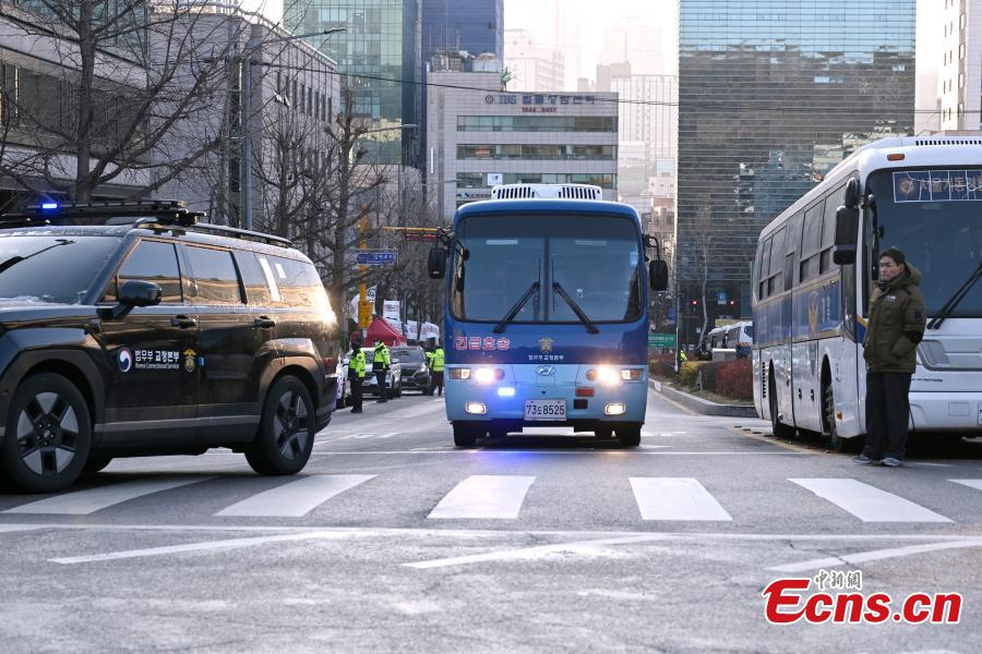 A blue bus carrying South Korea's former President Yoon Suk Yeol arrives at the Seoul Central District Court on Jan. 13, 2026. (Photo provided to China News Service)