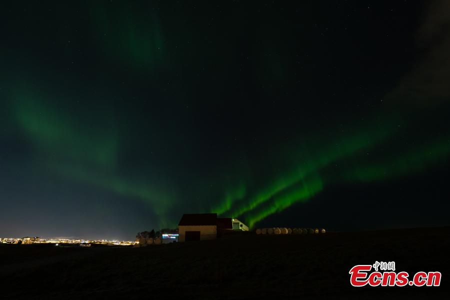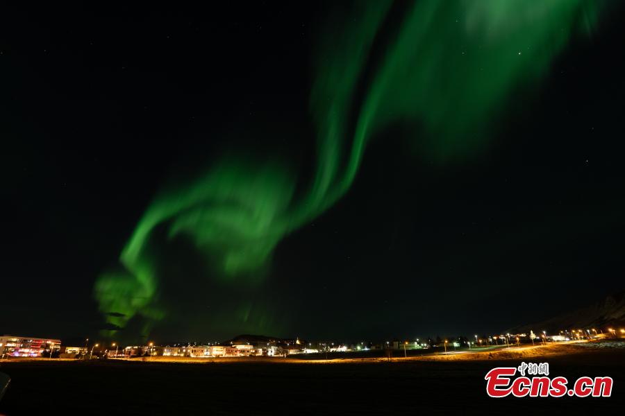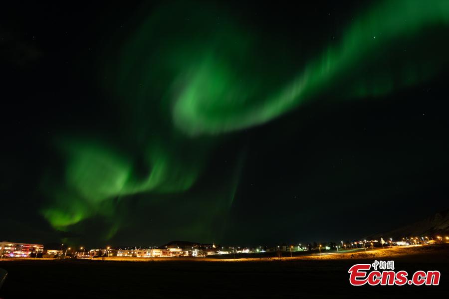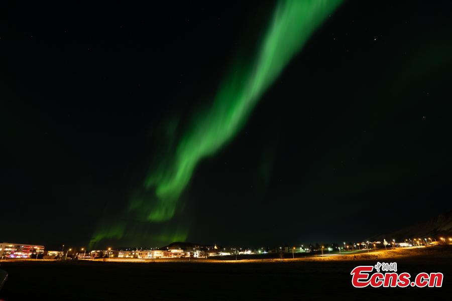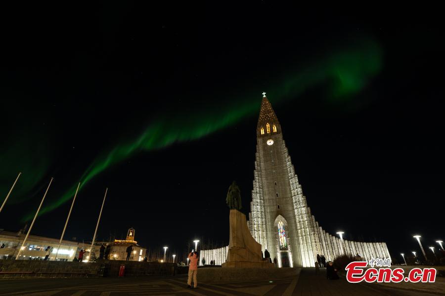 The northern lights illuminate the night sky over Hallgrimskirkja Church in Reykjavik, Iceland, on Jan. 11, 2026. (Photo/VCG)