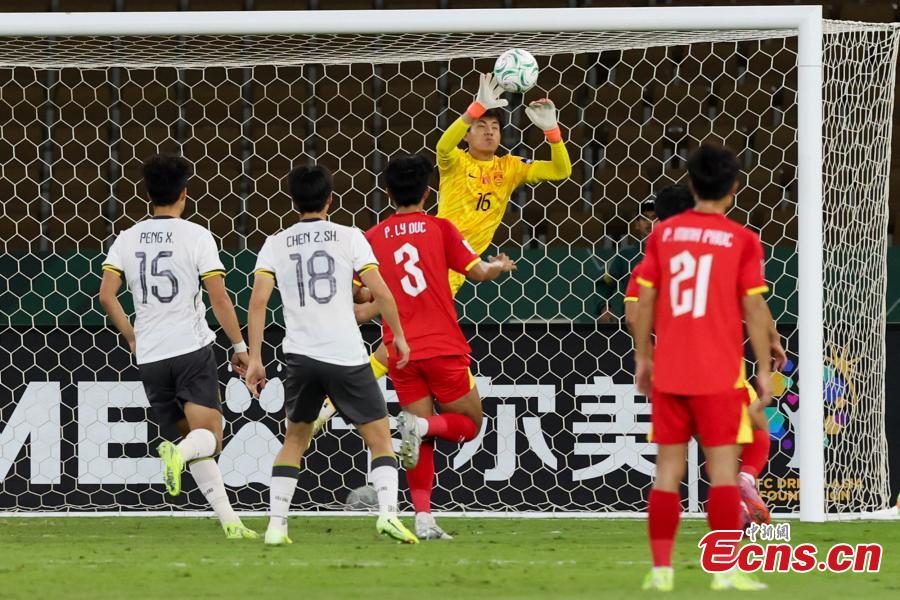 Chinese goalkeeper Li Hao makes a save during the 2026 AFC U23 Asian Cup semifinal match between China and Vietnam in Jeddah, Saudi Arabia, Jan. 20, 2026. (Photo/VCG)
