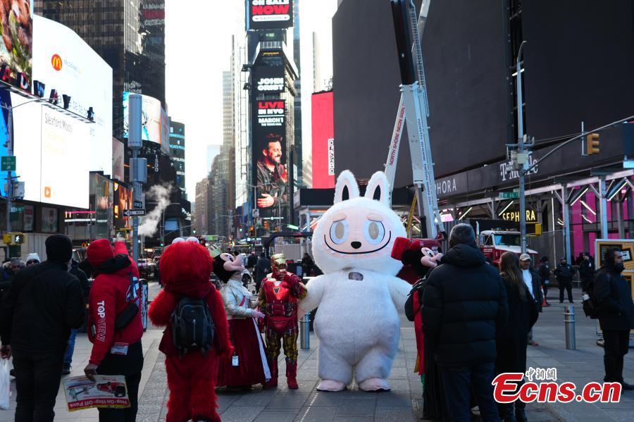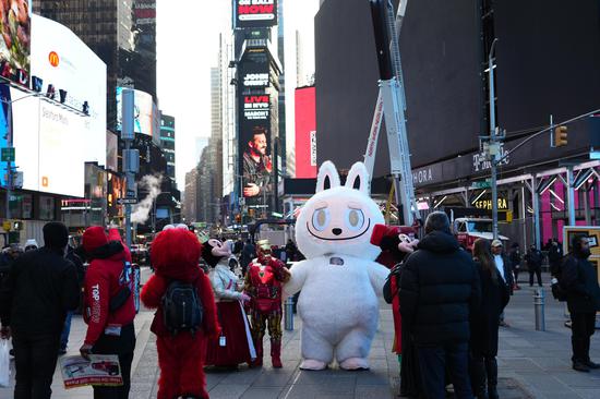 A Labubu appears at Times Square in New York, the United States, Jan. 22, 2026. Labubu, a trendy toy from China, has gained popularity worldwide. (Photo: China News Service/ Liao Pan)