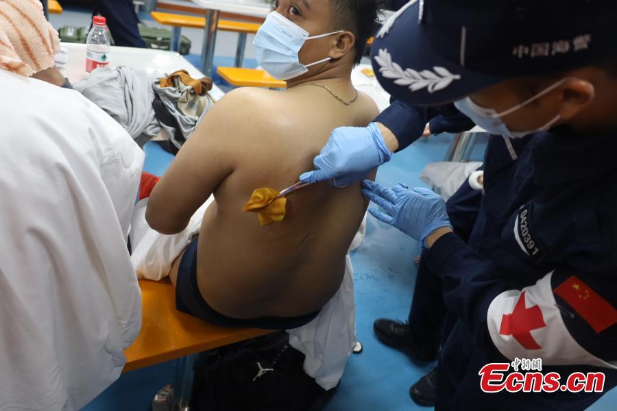 A medical worker from the China Coast Guard disinfects an injured Filipino crew member who were rescued from waters near Huangyan Dao.(Photo provided to China News Network)