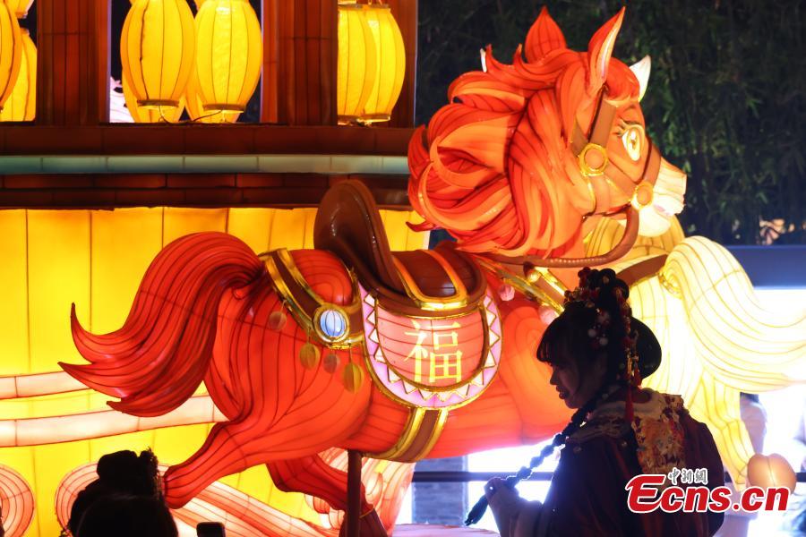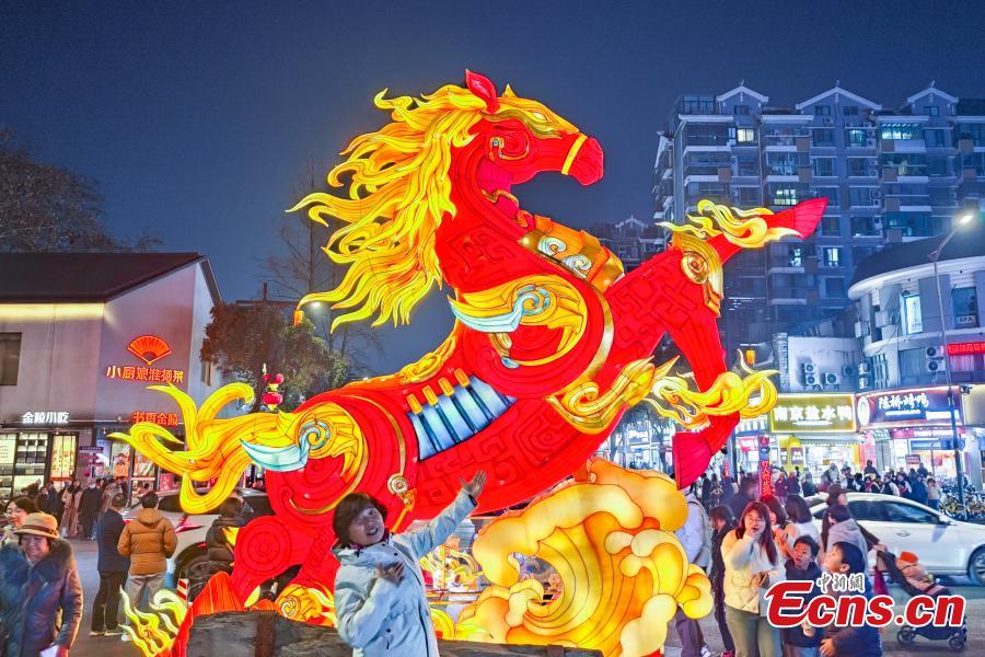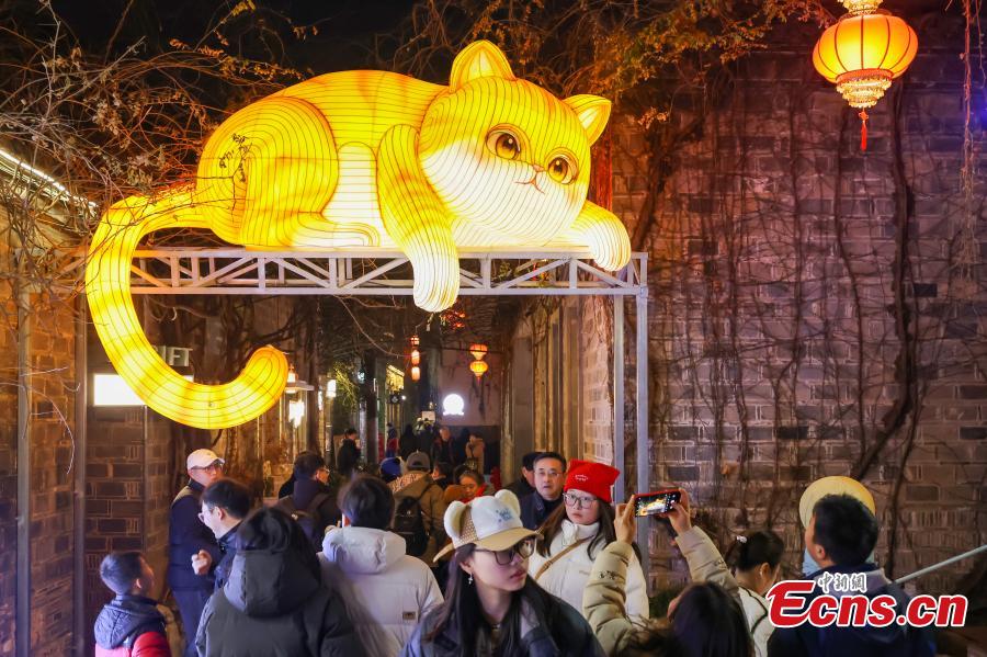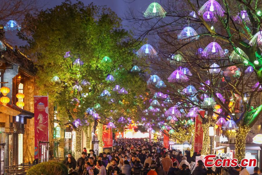 Residents and tourists stroll through the lantern-lit streets of Nanjing's southern old town in Jiangsu Province on Jan. 28, 2026. As the Spring Festival approaches, decorative light installations have been gradually illuminated, dressing the neighborhood in festive colors and creating a lively holiday atmosphere. (Photo: China News Service/Yang Bo)