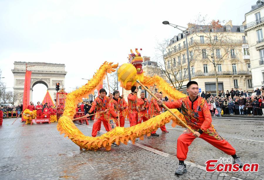 Dragon dance performers take part in a Chinese New Year celebration on the Champs-Elysées in Paris, France, Feb. 1, 2026, welcoming the Year of the Horse and sending festive greetings to the public. (Photo: China News Service/Li Yang)