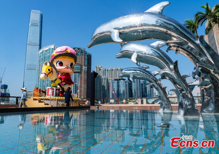 A 7-meter-tall jockey-style statue of "MOLLY" is installed at the podium garden of China Hong Kong City, Feb. 2, 2026. (Photo: China News Network/Hou Yu)