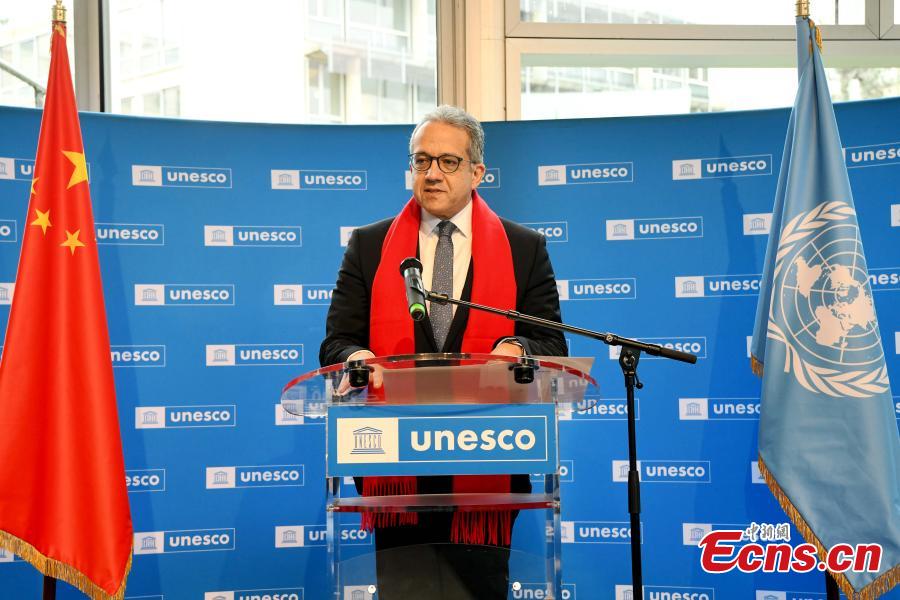UNESCO Director-General Khaled El-Enany delivers a speech during a Spring Festival event at UNESCO headquarter in Paris, France on Feb. 10, 2026. (Photo: China News Service/Li Yang)