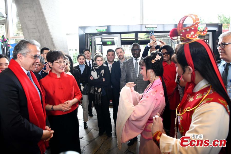 UNESCO Director-General Khaled El-Enany (first from left) and Ambassador, Permanent Delegate of China to UNESCO Yang Xinyu (second from left) attend a Spring Festival temple fair at UNESCO headquarter in Paris, France on Feb. 10, 2026. (Photo: China News Service/Li Yang)