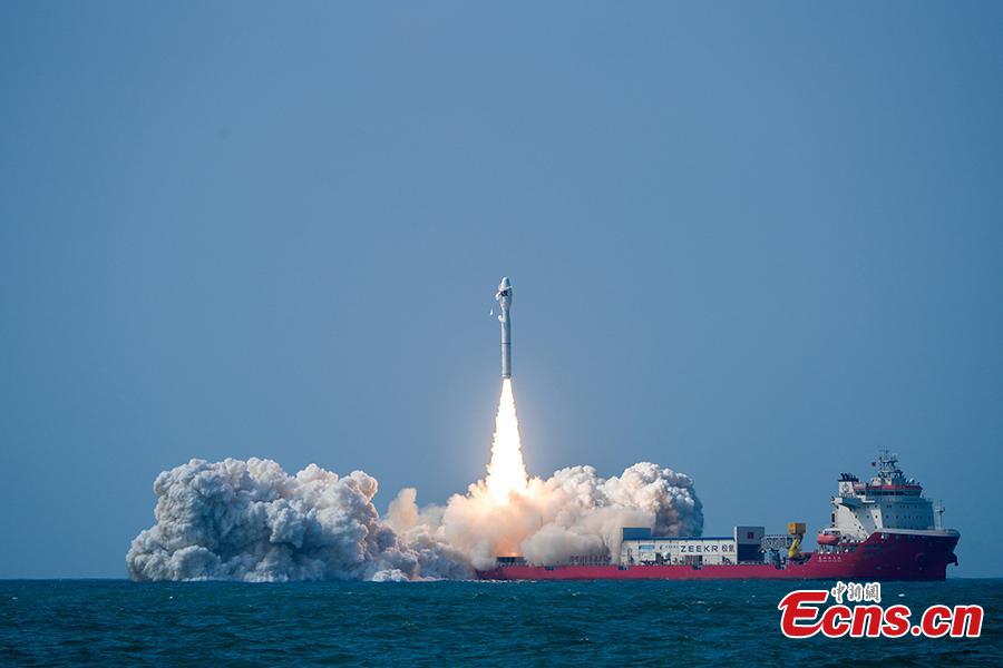A Smart Dragon-3 (SD-3) carrier rocket carrying seven satellites blasts off at 14:37 Beijing Time from waters off the coast of Yangjiang in south China's Guangdong Province, Feb. 12, 2026. (Photo by Guo Jinqi / For China News Service)