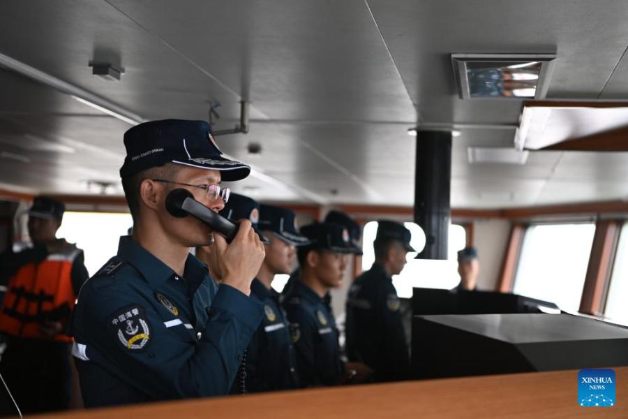 A law enforcer aboard the China Coast Guard (CCG) vessel Wanshan issues navigation orders during a patrol mission in the territorial waters of China's Huangyan Dao, Feb. 6, 2026. (Photo by Zhai Yifan/Xinhua)