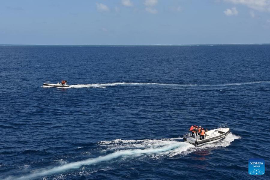 Small boats released by the China Coast Guard (CCG) vessel Wanshan conduct a law enforcement drill in the territorial waters of China's Huangyan Dao, Feb. 4, 2026. (Photo by Zhai Yifan/Xinhua)
