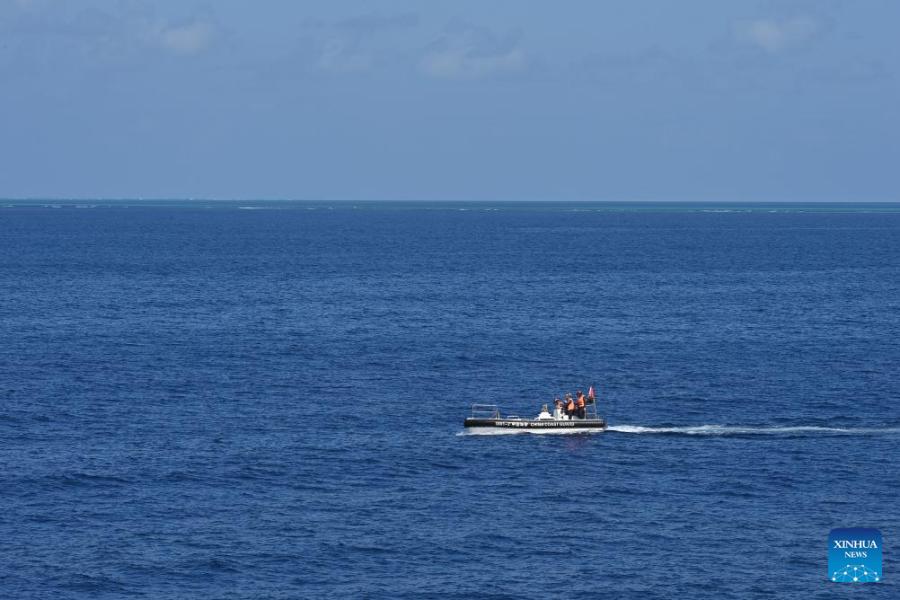 A small boat released by the China Coast Guard (CCG) vessel Wanshan conducts a law enforcement drill in the territorial waters of China's Huangyan Dao, Feb. 4, 2026. (Photo by Zhai Yifan/Xinhua)