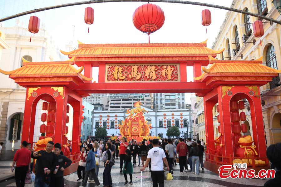 Residents and tourists pose for photos with horse-themed Chinese New Year decorations at Senado Square in Macao on February 13, 2026. (Photo: China News Service/Zheng Jiawei)