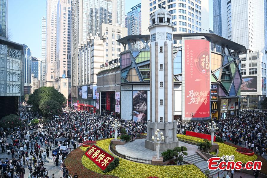 Tourists visit the Jiefangbei Pedestrian Street in southwest China's Chongqing Municipality on Feb. 21, 2026. (Photo: China News Service/He Penglei)
