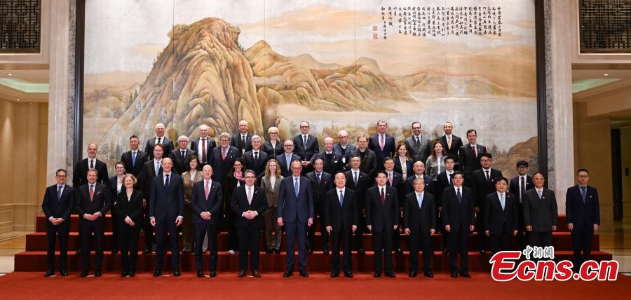 German Chancellor Friedrich Merz visits Hangzhou City, Zhejiang Province, Feb. 26, 2026, during his visit to China and poses for a group photo with business representatives from both China and Germany. (Photo: China News Service/Wang Gang)