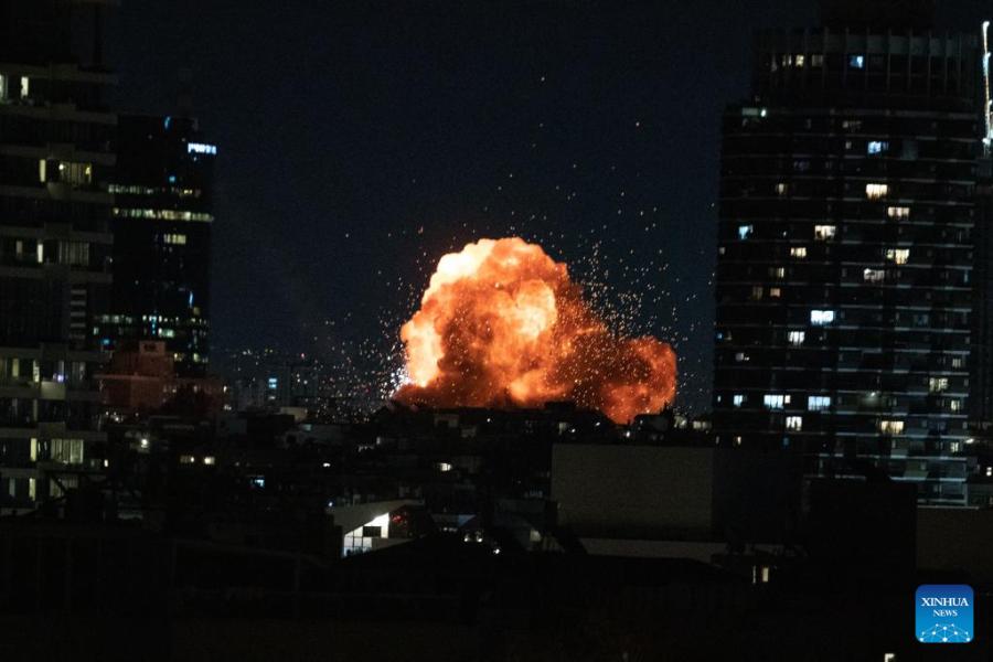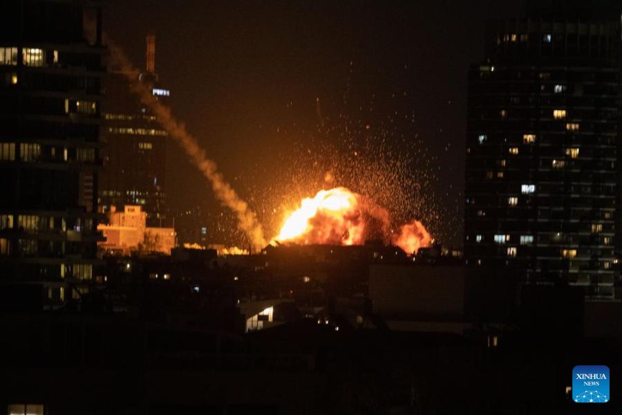 This photo taken on Feb. 28, 2026 shows an explosion in downtown Tel Aviv, Israel. (Xinhua/Chen Junqing)