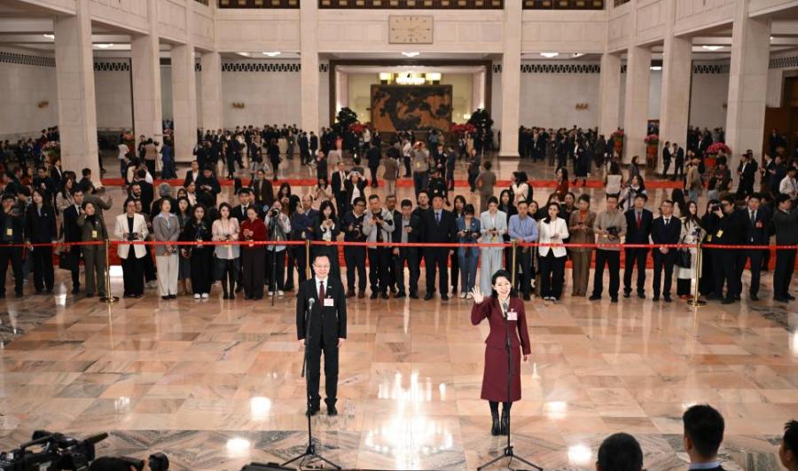 Deputies to the 14th National People's Congress (NPC) attend a group interview ahead of the closing meeting of the fourth session of the 14th NPC at the Great Hall of the People in Beijing, capital of China, March 12, 2026. (Photo/Xinhua)