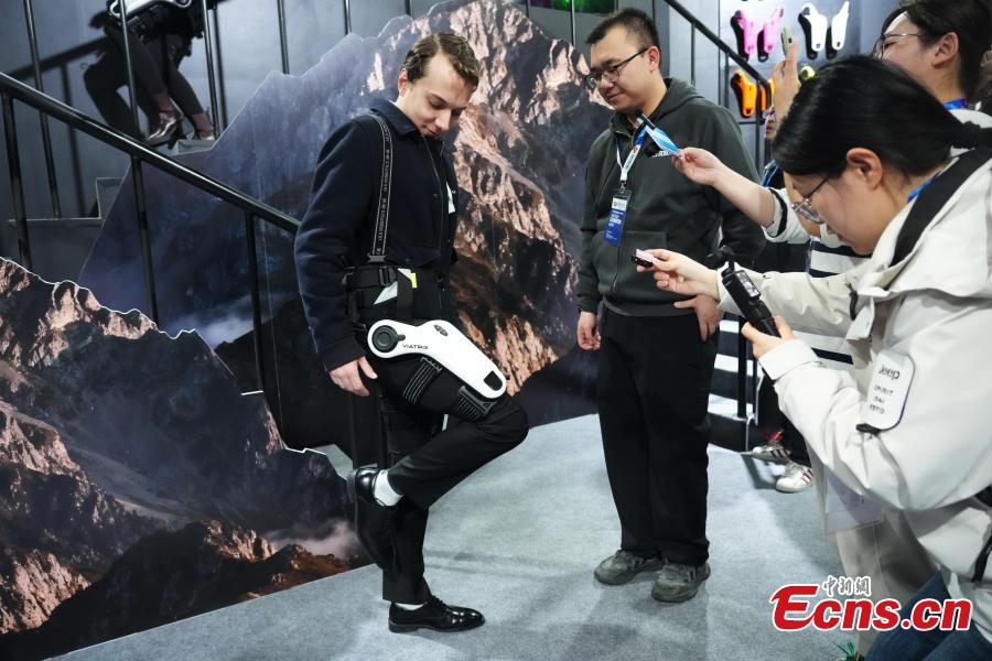 A human exoskeleton device attracts visitors eager to experience the technology at the 2026 Appliance & Electronics World Expo (AWE 2026) in Shanghai on March 12, 2026. (Photo: China News Service/Zhang Hengwei)