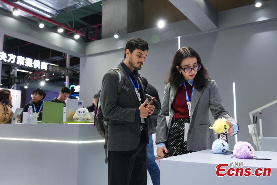 Foreign visitors learn about a Chinese AI companion pet at the 2026 Appliance & Electronics World Expo (AWE 2026) in Shanghai on March 12, 2026. (Photo: China News Service/Zhang Hengwei)