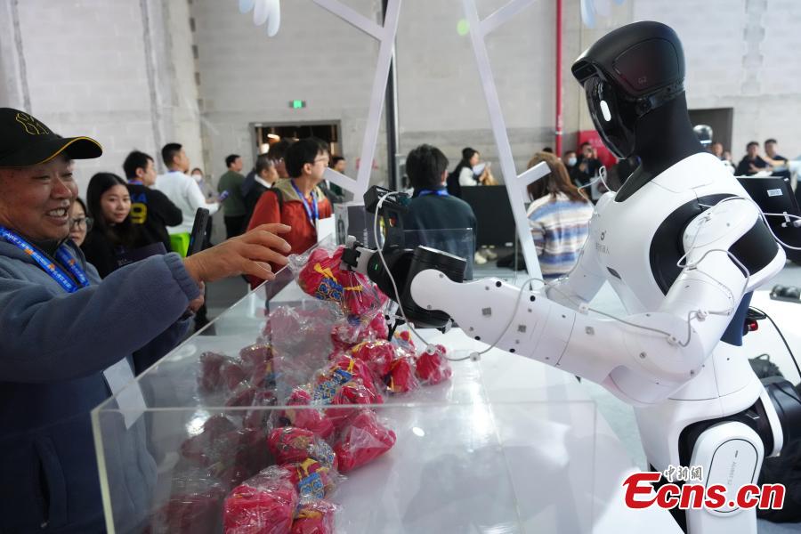 A humanoid robot distributes gifts to visitors at the 2026 Appliance & Electronics World Expo (AWE 2026) in Shanghai on March 12, 2026. (Photo: China News Service/Zhang Hengwei)