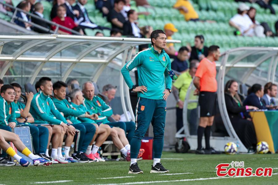Head Coach of China Shao Jiayi reacts during the FIFA Series 2026 International Friendly Match between China and Cameroon in Melbourne, Australia, March 31, 2026. (Photo: China News Service/Qi Andi)