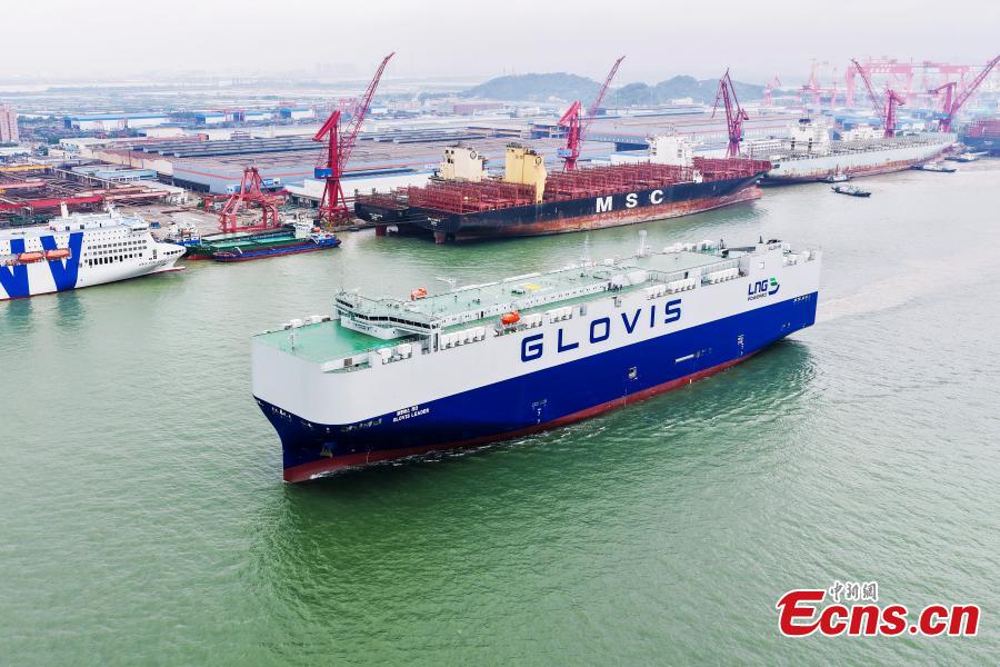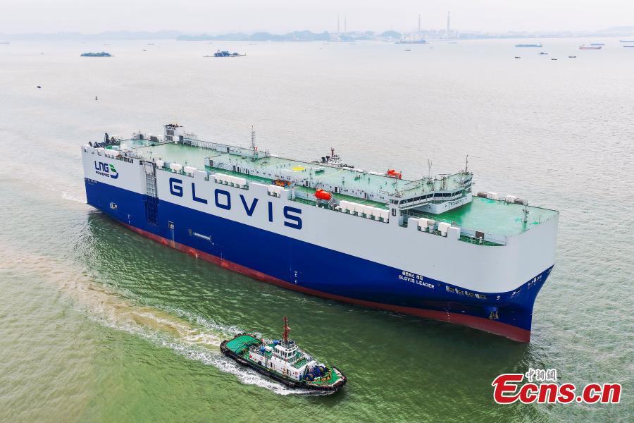 A 10,800-car LNG dual-fuel pure car and truck carrier (PCTC), built by Guangzhou Shipyard International for South Korea's HMM, sets out on its sea trial from Nansha, Guangzhou Province, March 31, 2026. (Photo: China News Service/Zhong Wei)
