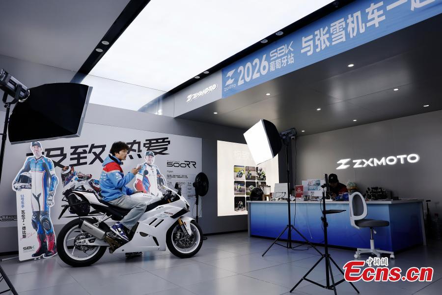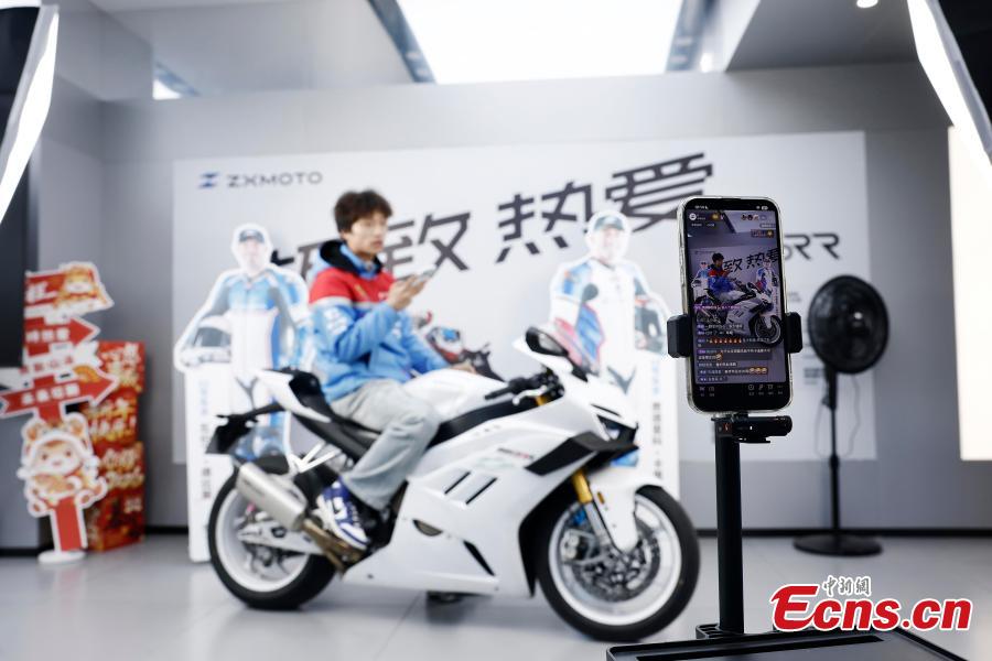 A staff member livestreams the championship-winning 820RR model at ZXMOTOR store in Shanghai, April 2, 2026. (Photo: China News Service/Yin Liqin)