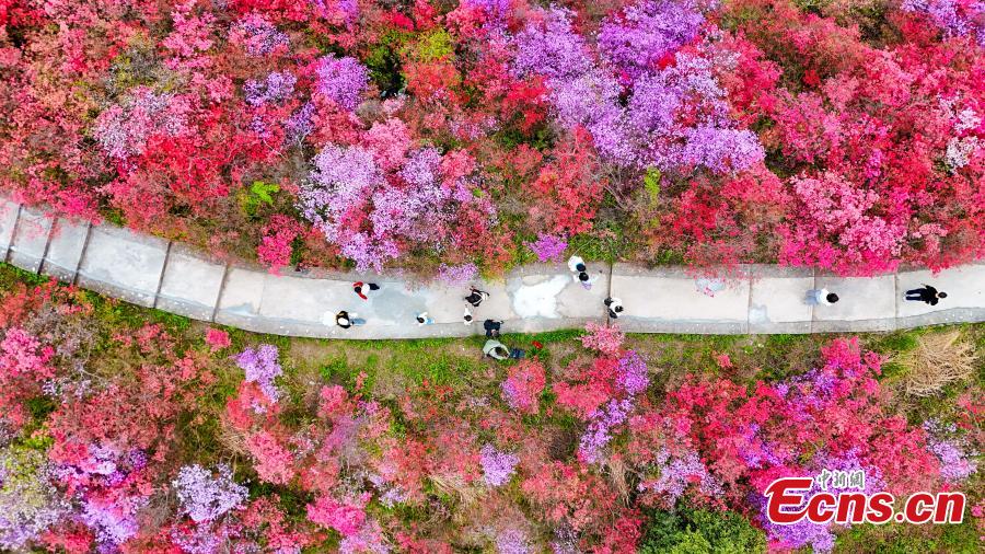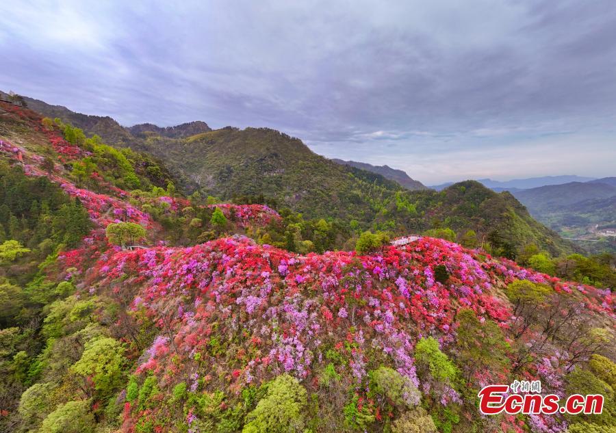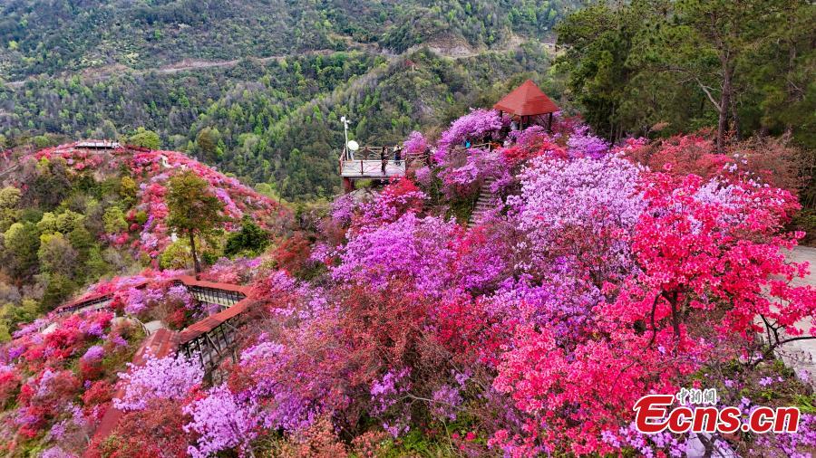 Wild alpine azaleas bloom at the Tianxia scenic spot in Yuexi County, east China's Anhui Province, in the heart of the Dabie Mountains, attracting visitors for sightseeing and leisure, April 6, 2026. (Photo provided to China News Service)