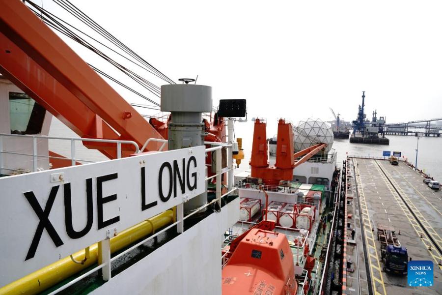 China's research icebreaker Xuelong docks at its base in Shanghai, east China, April 9, 2026. Xuelong, or Snow Dragon, returned to Shanghai on Thursday after a 160-day-long voyage which formed part of the country's 42nd Antarctic expedition. (Xinhua/Zhang Jiansong)