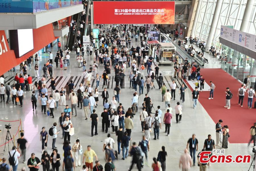 The exhibition halls of the Canton Fair are bustling with crowds on April 15, 2026 in the southern Chinese city of Guangzhou. (Photo: China News Service/Chen Chuhong)
