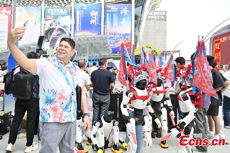 An overseas buyer poses for a photo with a robot performing Yingge dance, a form of folk dance popular in south China's Guangdong Province, at 139th edition Canton Fair, April 15, 2026. (Photo: China News Service/Chen Chuhong)