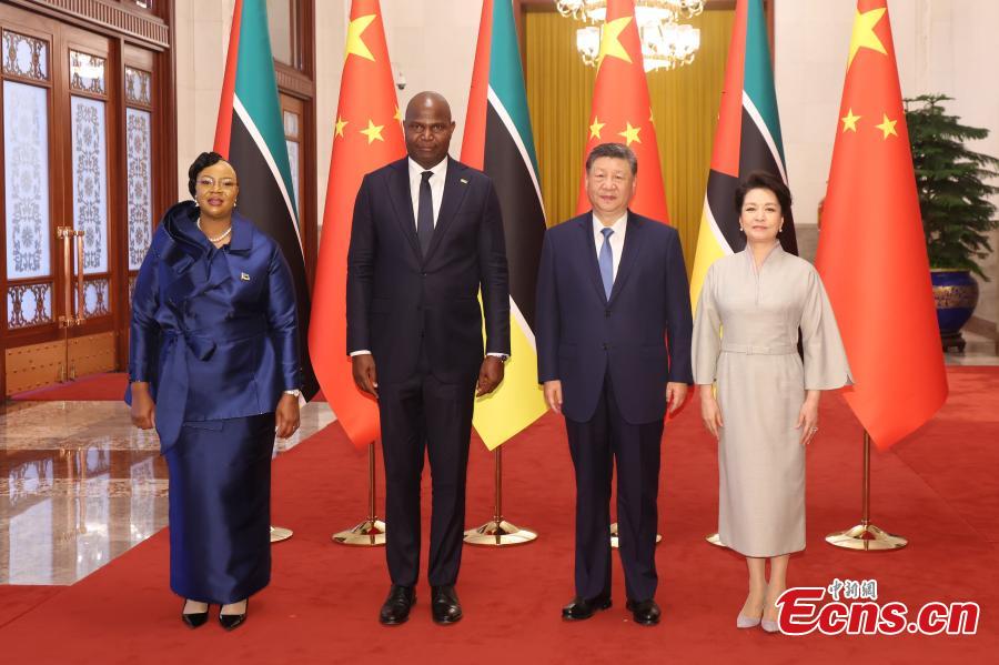 Chinese President Xi Jinping and his wife Peng Liyuan pose for a group photo with President of the Republic of Mozambique Daniel Francisco Chapo and his wife Gueta Chapo ahead of the talks between Xi and Chapo at the Great Hall of the People in Beijing, capital of China, April 21, 2026. Xi held talks with Chapo, who is on a state visit to China, in Beijing on Tuesday. (Photo: China News Service/Sheng Jiapeng)