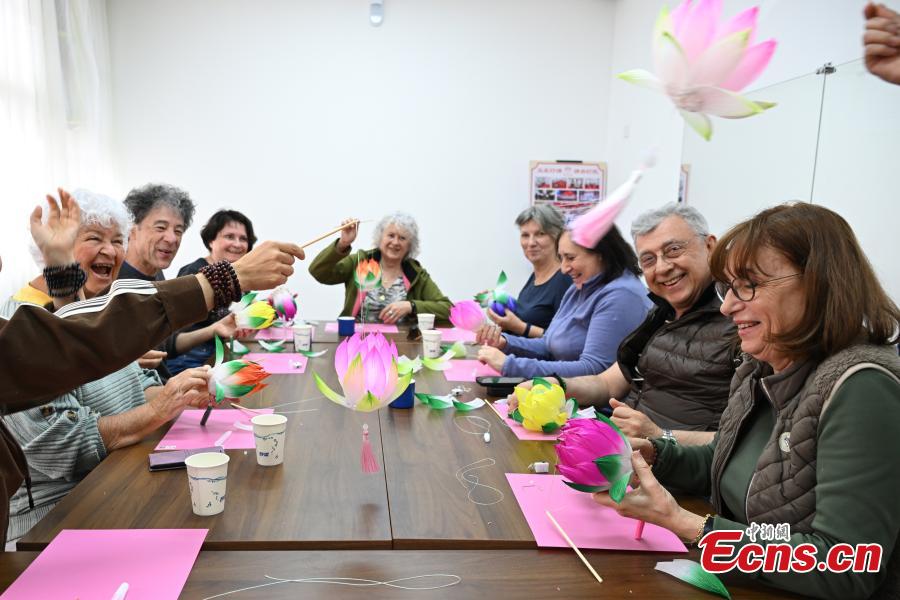 A French senior study tour group learns to make traditional lotus lanterns, an item of intangible cultural heritage, in Beijing on April 21, 2026. (Photo: China News Service/Tian Yuhao)