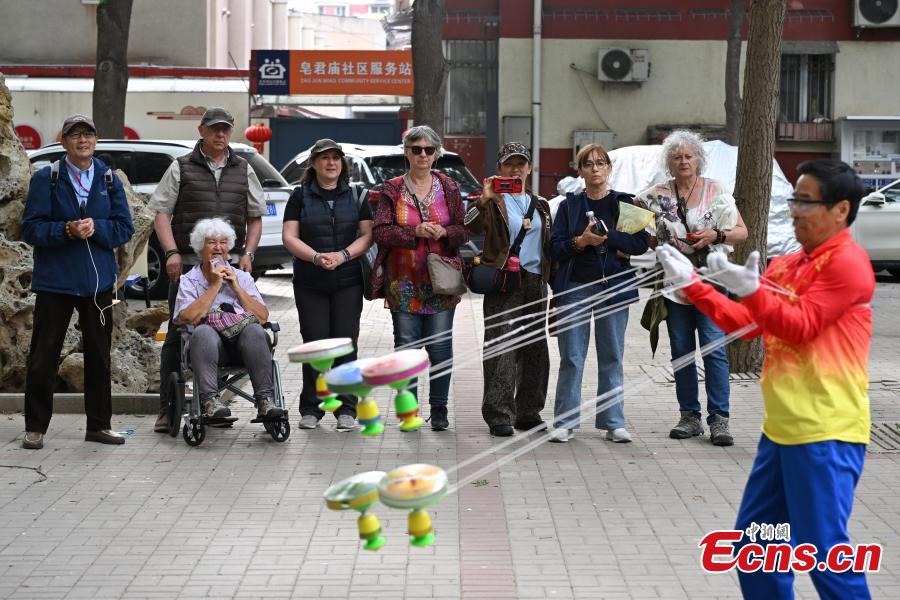 A French senior study tour group experiences diabolo (Chinese yo-yo) in Beijing on April 21, 2026. (Photo: China News Service/Tian Yuhao)