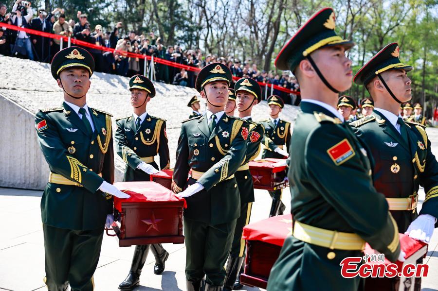 Caskets containing the remains of Chinese People's Volunteers (CPV) martyrs are escorted by honor guards during a burial ceremony at the CPV martyrs' cemetery in Shenyang, northeast China's Liaoning Province, April 23, 2026. (Photo: China News Service/Yu Haiyang)
