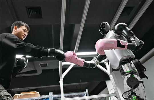A technician checks a humanoid robot at a lab in Hefei, Anhui province. (ZHANG DAGANG/FOR CHINA DAILY)