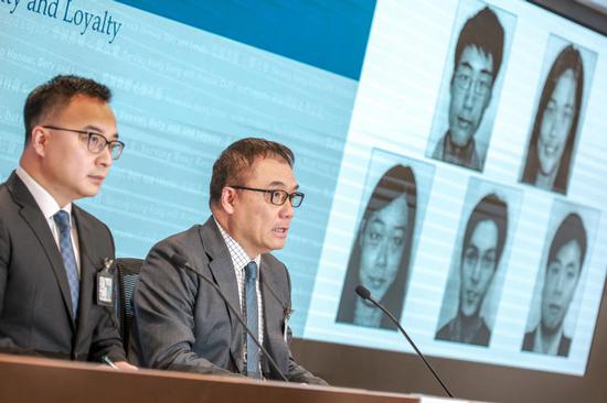 Police officials present photos and details of five fugitives suspected of violating the National Security Law for Hong Kong during a press conference at the Police Headquarters on Dec 14, 2023. (ANDY CHONG/CHINA DAILY)