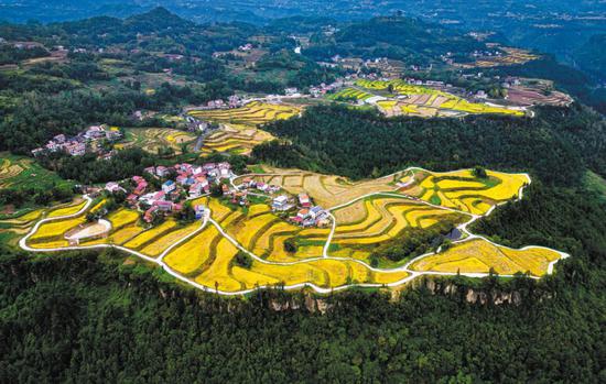 Well-paved roads run through terraced paddy fields at Bayi village in Henghe Tujia township of Chongqing, providing easy access to farming machinery. (RAN MENGJUN/FOR CHINA DAILY)